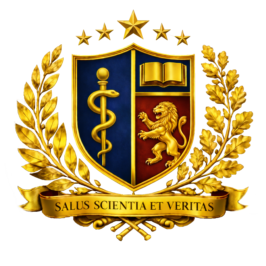 El logotipo presentado es un emblema heráldico complejo que combina elementos tradicionales de la academia, la medicina y la nobleza, diseñado con un acabado en relieve dorado sobre un escudo dividido.